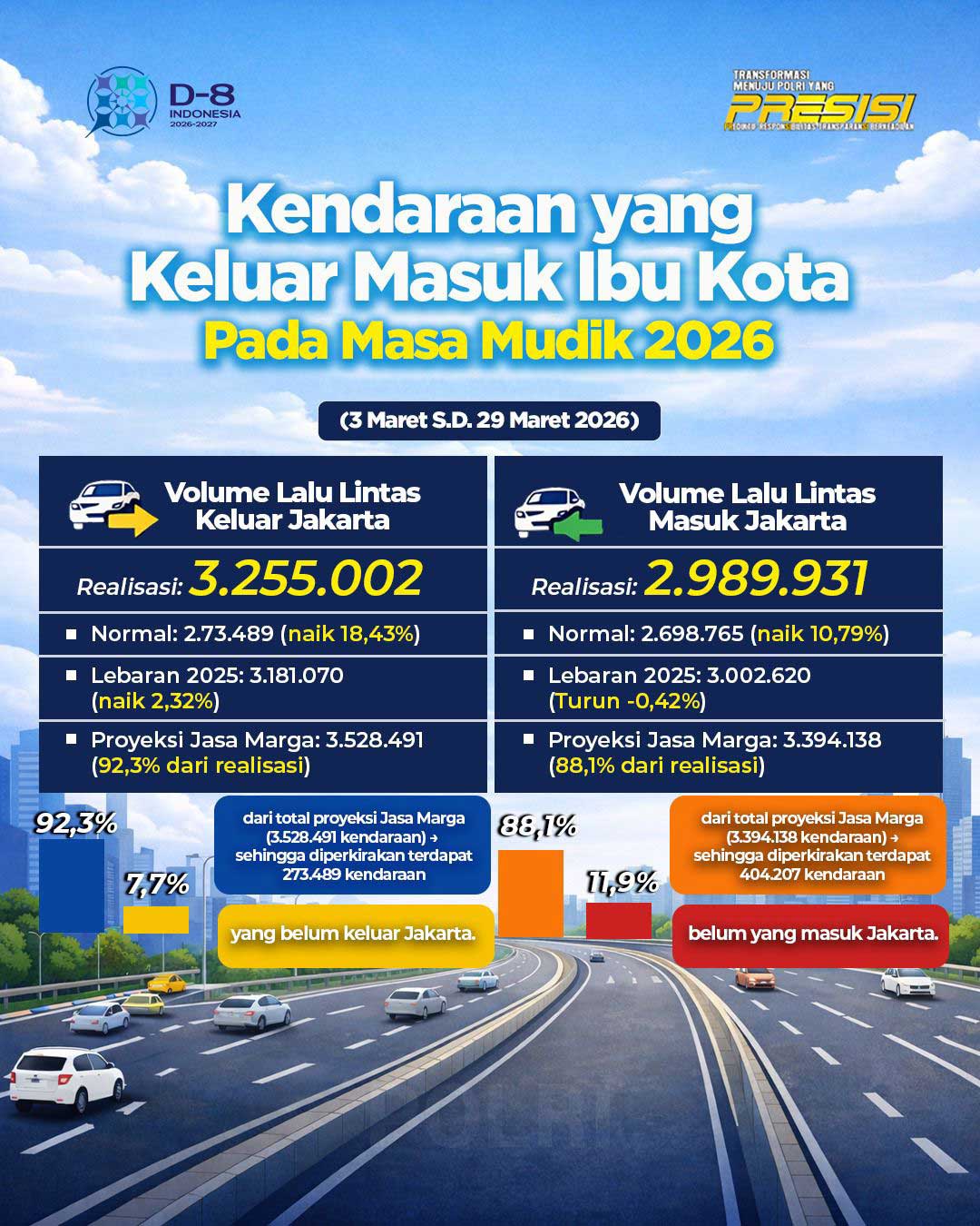 Melalui saluran WhatsApp resmi Humas Polri membeberkan, Pada periode 13–29 Maret 2026, sebanyak 3,25 juta kendaraan tercatat keluar dari Ibu Kota, naik 18,43 persen dibanding kondisi normal.