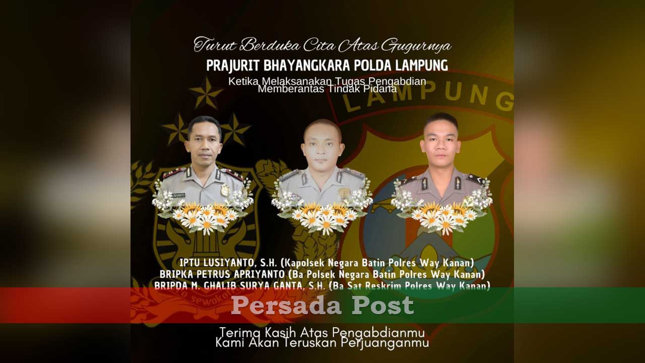 Lampung – Persada Post | Kabar duka datang dari Provinsi Lampung, terkait gugurnya tiga anggota Polisi Polda Lampung, saat melakukan penggrebekan tempat yang diduga untuk judi sabung ayam, Senin (17/3/2025) siang tadi, di di Kampung Karang Manik, Kecamatan Negara Batin, Kabupaten Way Kanan.
